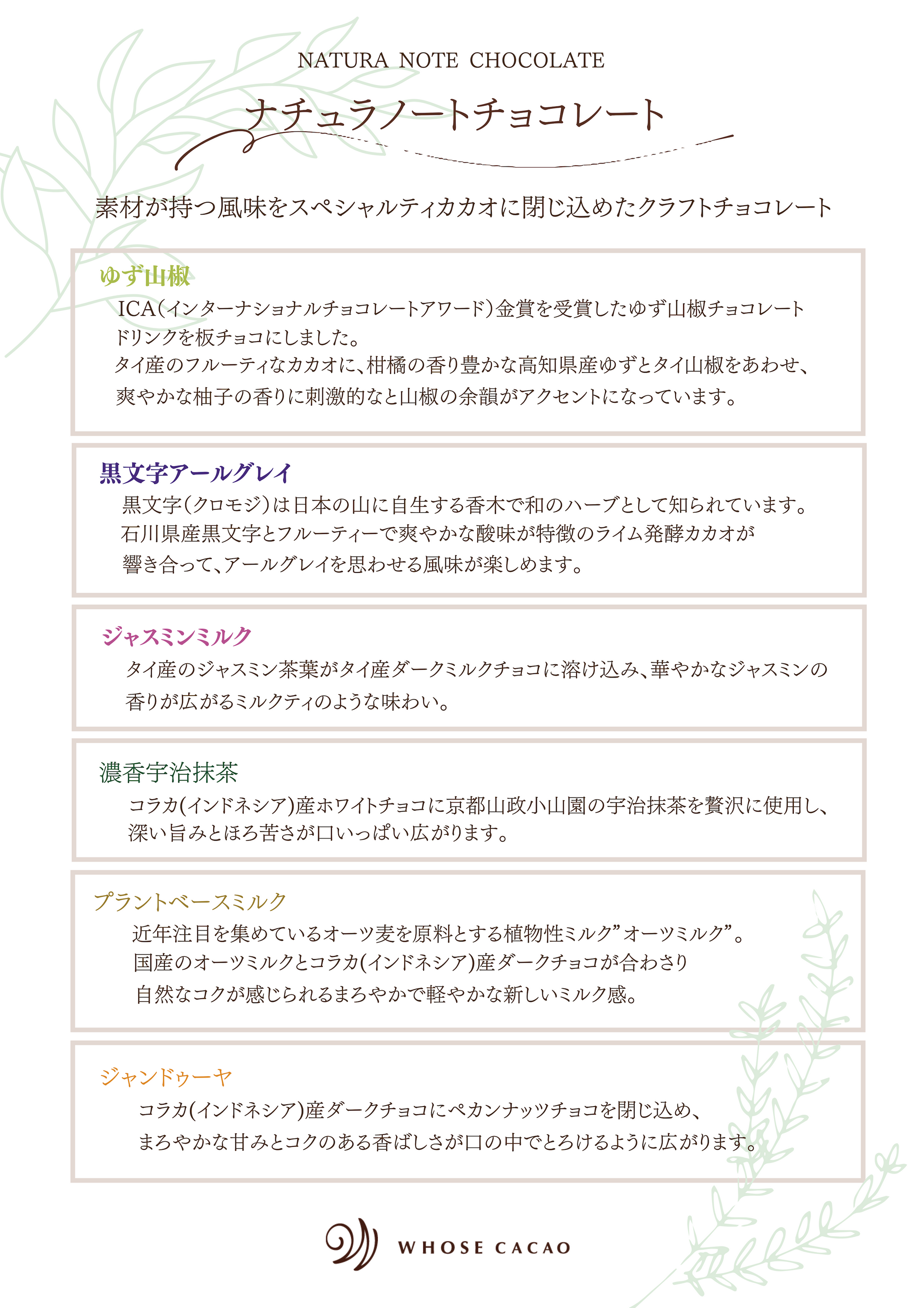 黒文字(クロモジ)は日本の山に自生する香木で和のハーブとして知られています。石川県産黒文字とフルーティーで爽やかな酸味が特徴のライム発酵カカオが響き合って、アールグレイを思わせる風味が楽しめます